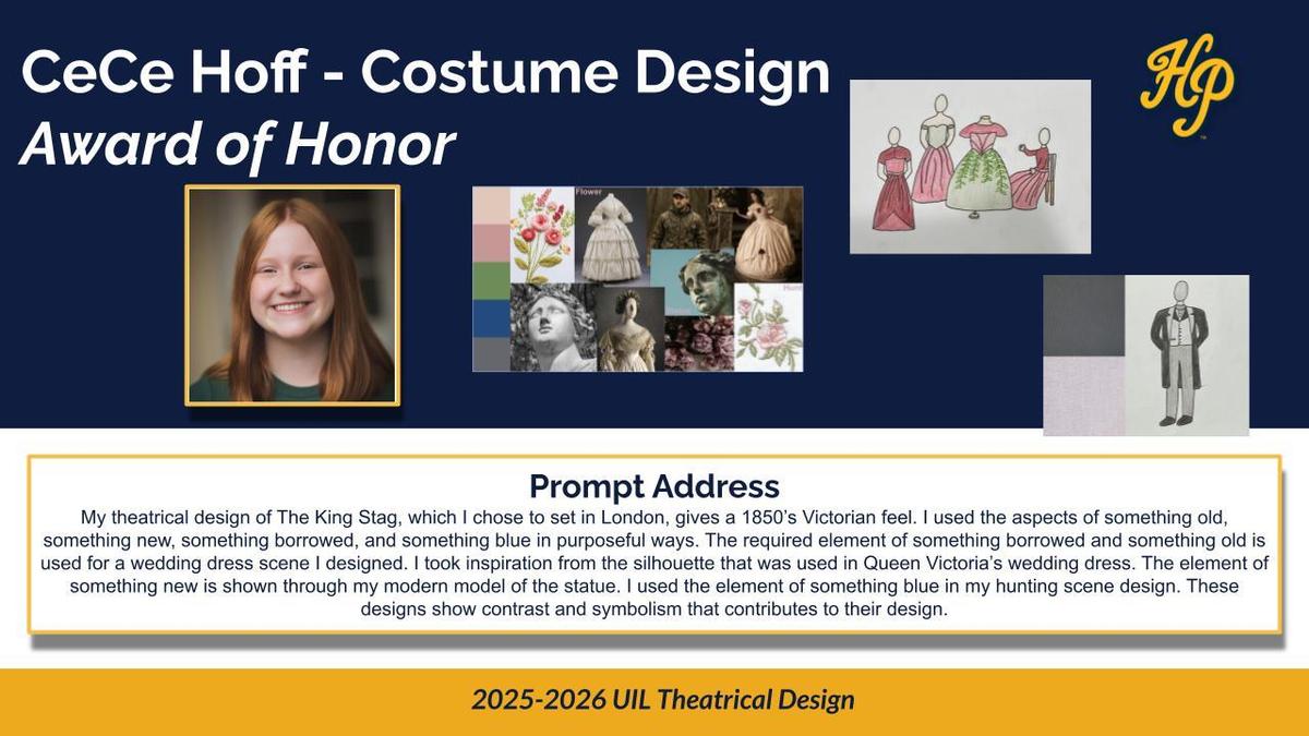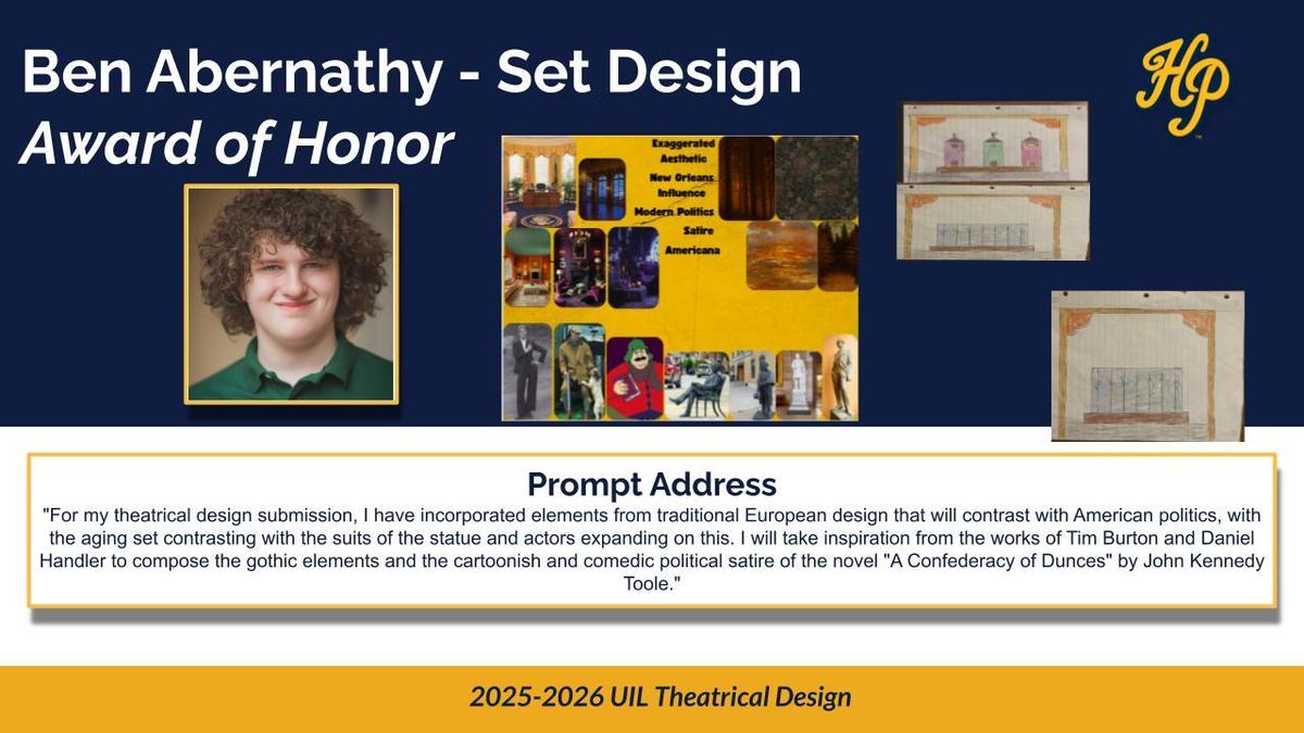 Highland Park High School students have been recognized for their outstanding work in the 2025–2026 UIL Theatrical Design competition, earning multiple honors across several categories.