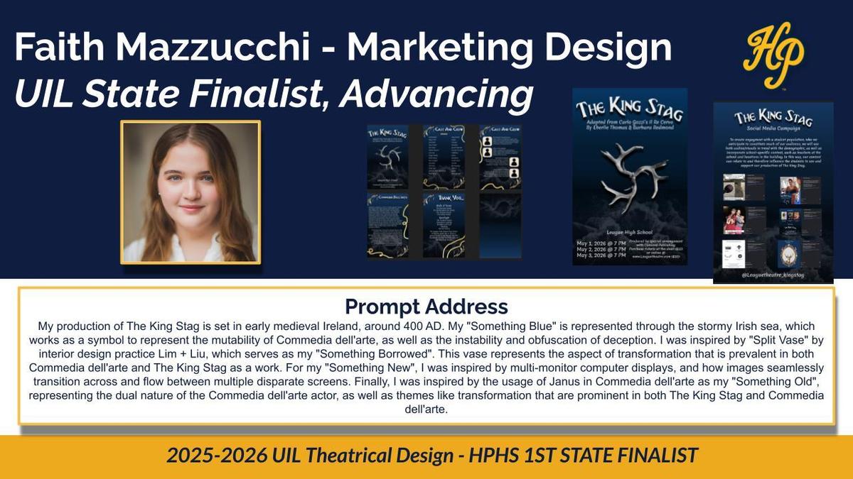 Senior Faith Mazzucchi was named a State Finalist in Marketing Design and will advance to the UIL Theatrical Design State Contest this May in Austin. Faith is one of only 15 students selected from all 5A schools in Texas to compete at the state level.